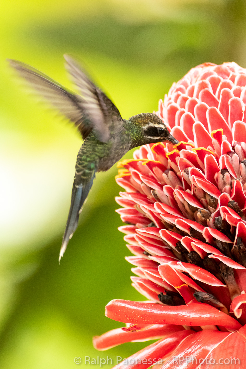 A White-whiskered Hermit feeds from a torch ginger plant.