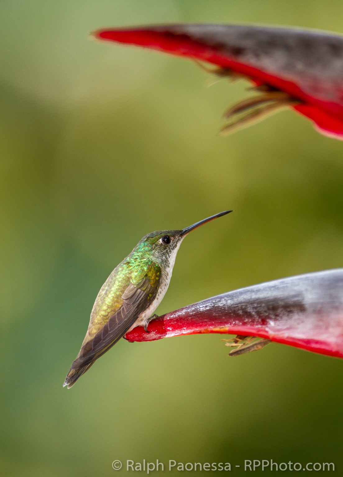 An Andean Emerald perches on a heliconia plant.