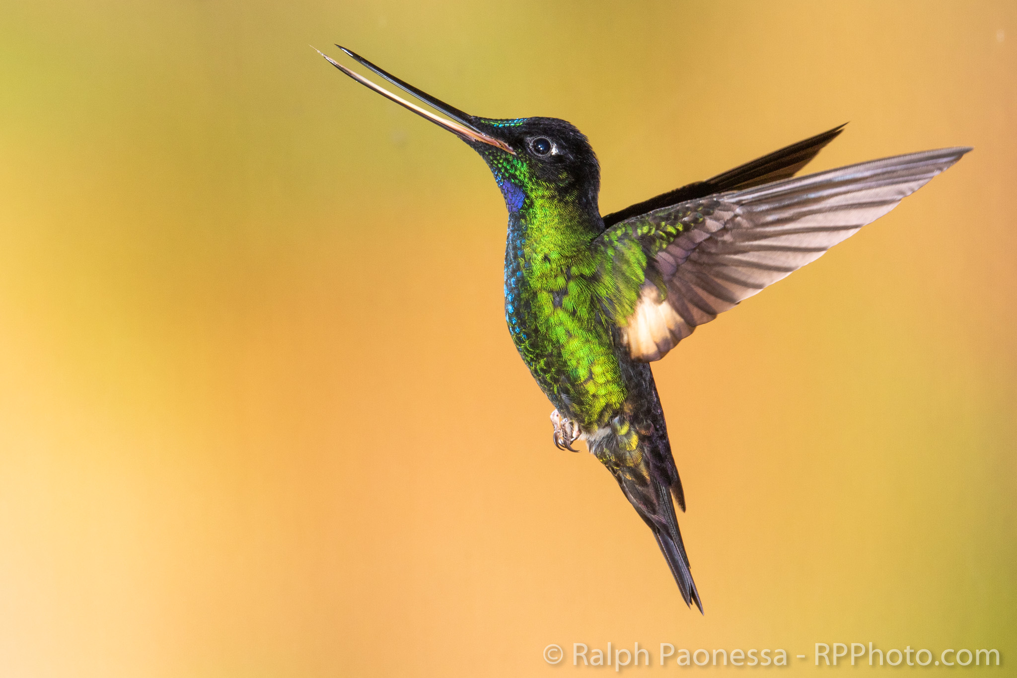A male Buff-winged Starfrontlet opens his bill to make his loud, characteristic squeaking call.